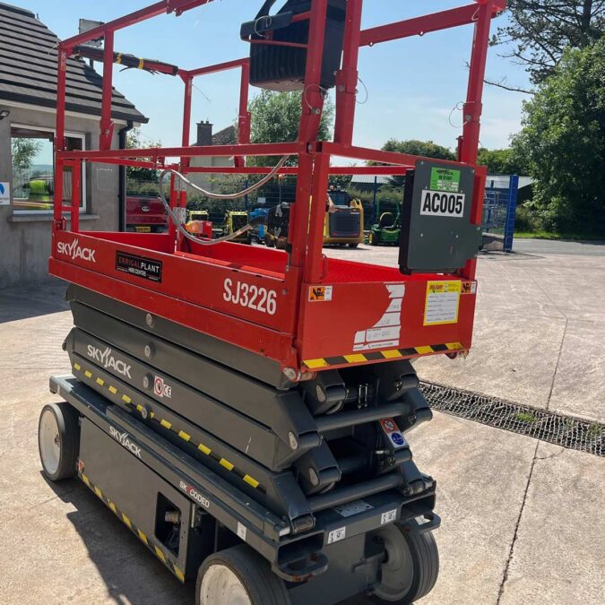 The Skyjack SJ3226 is a compact electric scissor lift designed for efficient operation in confined spaces. It offers a maximum working height of 9.75 meters and a platform capacity of 227 kg, accommodating up to two occupants. The platform measures 2.13 meters by 0.71 meters, with a 0.91-meter roll-out extension for extra reach. With an overall width of 0.81 meters and a stowed height of 2.15 meters (1.79 meters with folded guardrails), it easily navigates standard doorways. Its 1.27-meter inside turning radius and 30% gradeability enhance maneuverability, while solid non-marking tires make it ideal for indoor use. Weighing 1,876 kg, the SJ3226 is drivable at full height and includes collapsible guardrails and a power-to-platform outlet for added convenience.